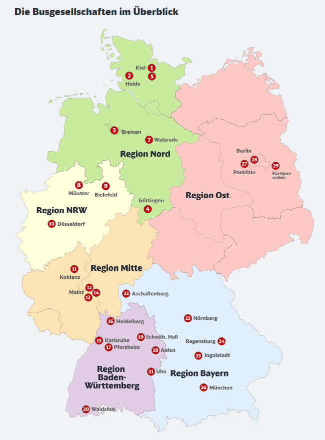 DB Busgesellschaften in ganz Deutschlang bringen mit insgesamt 4640 eigenen und zahlreichen Bussen von Auftragnehmern jährlich rund 497 Millionen Fahrgäste sicher an ihr Ziel. Dabei profitiert DB Regio Bus von den regional unterschiedlichen Erfahrungen der Gesellschaften, ist schlagkräftiger im Wettbewerb und kann Innovationen besser vorantreiben.